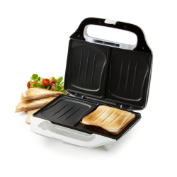 Sendvičovač a vaflovač 2v1 s výměnnými deskami na 4 sendviče ve tvaru mušle, nebo na 4 vafle. Příkon 1200 W. Kvalitní nepřilnavý povrch. Možnost uskladnění ve svislé poloze.