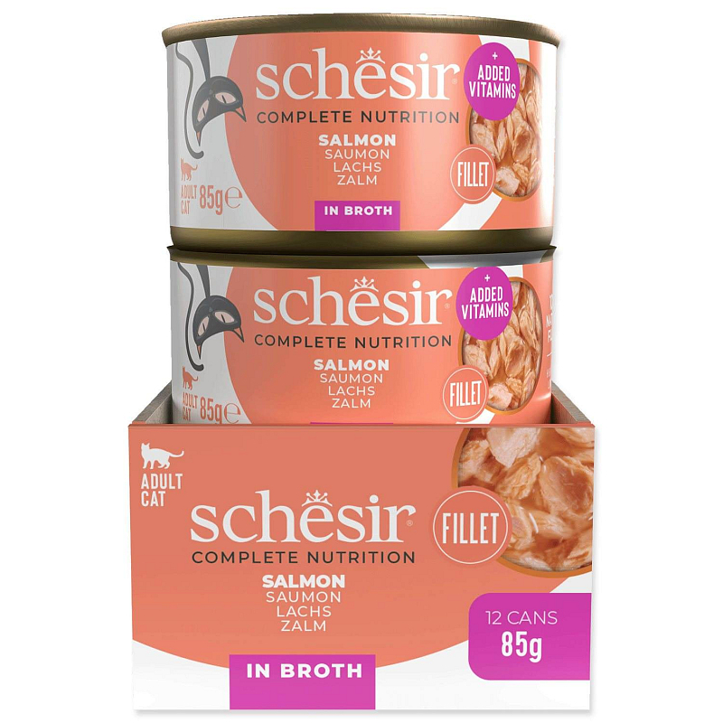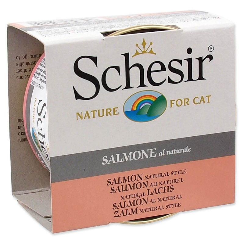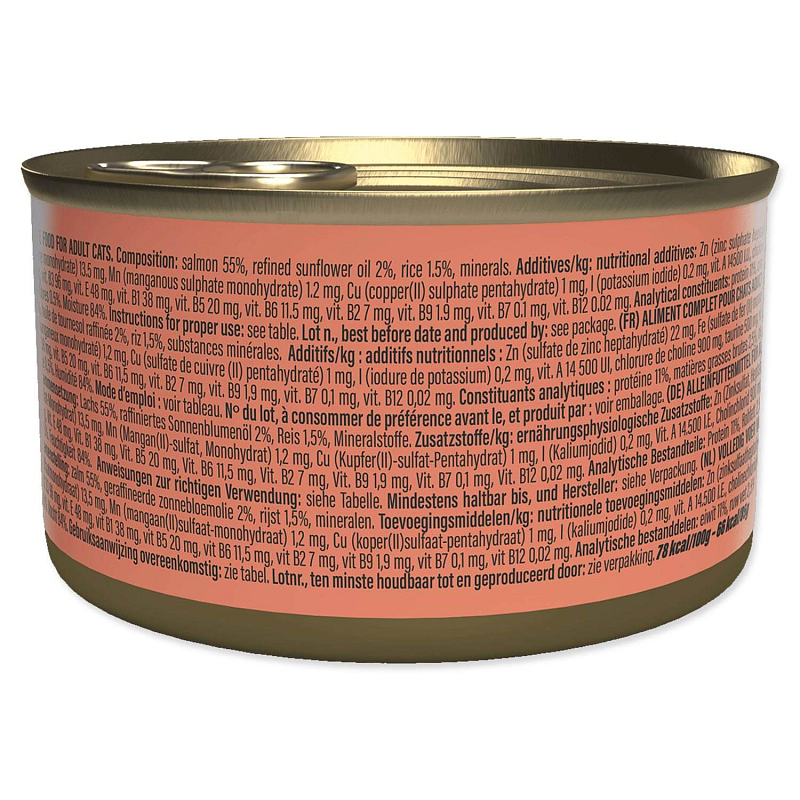Konzerva s přírodním lososem. Doplňkové krmivo pro dospělé kočky.
