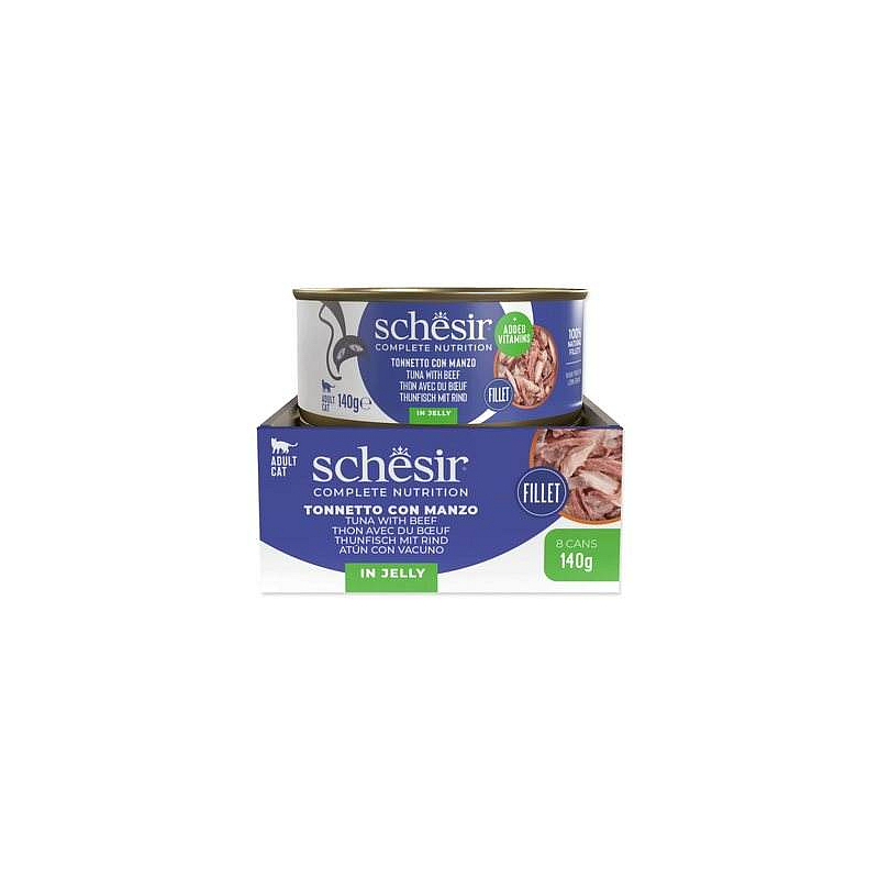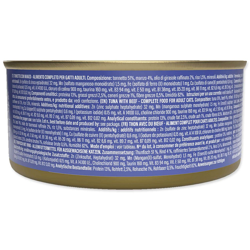 Konzerva s masem z tuňáka a hovězími filetami. Doplňkové krmivo pro dospělé kočky.