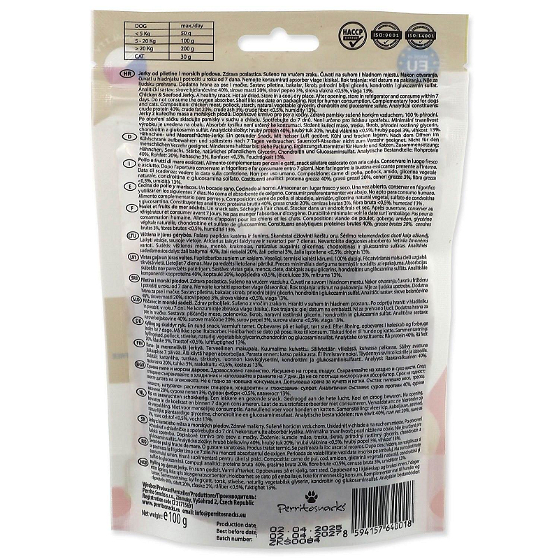 100% přírodní jerky z kuřecího masa a mořských plodů pro malé psy a kočky.
