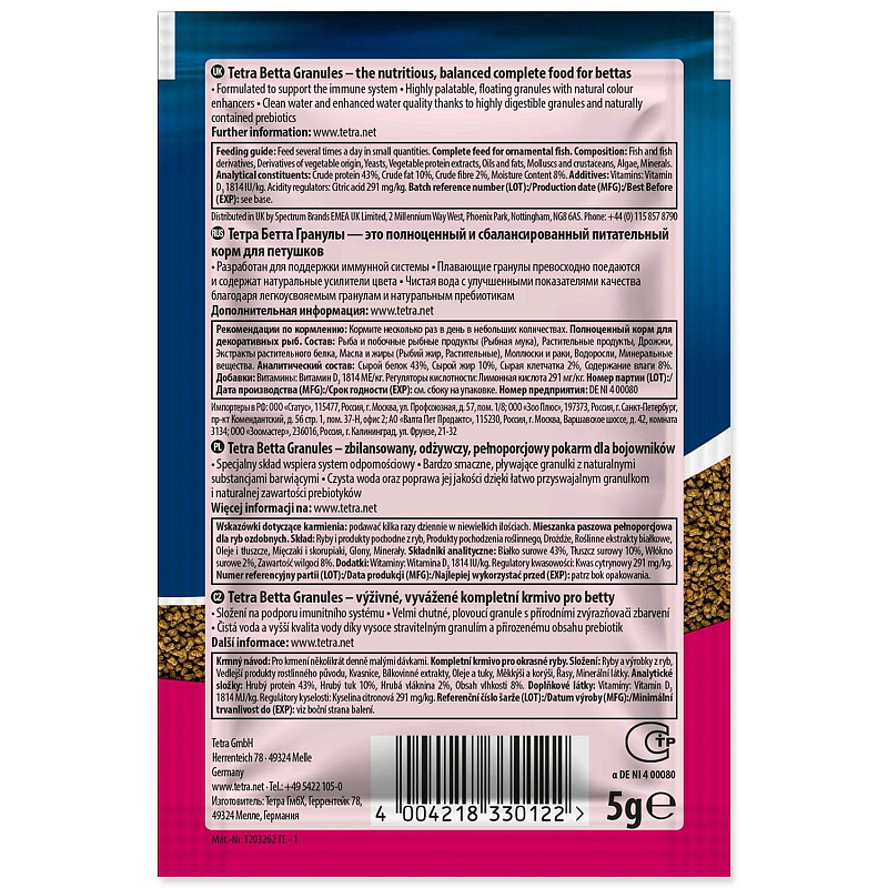 Složení: ryby a výrobky z ryb, obiloviny, sušené krmné kvasnice, měkkýši a korýši, vejce a výrobky z vajec, oleje a tuky, cukr, řasy, lecitin.