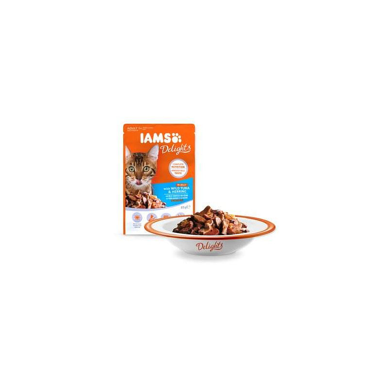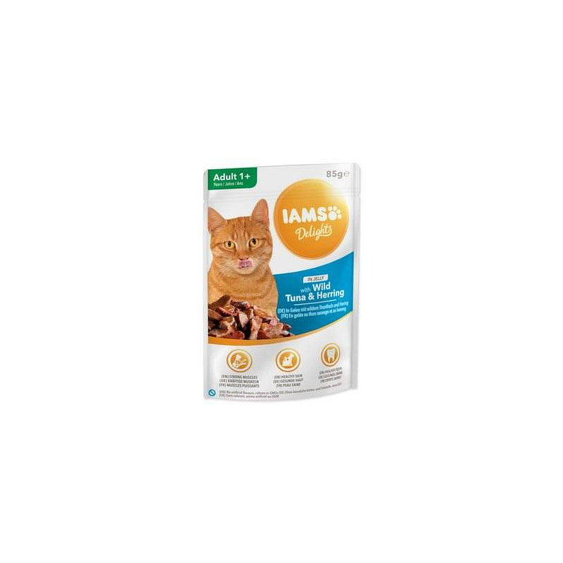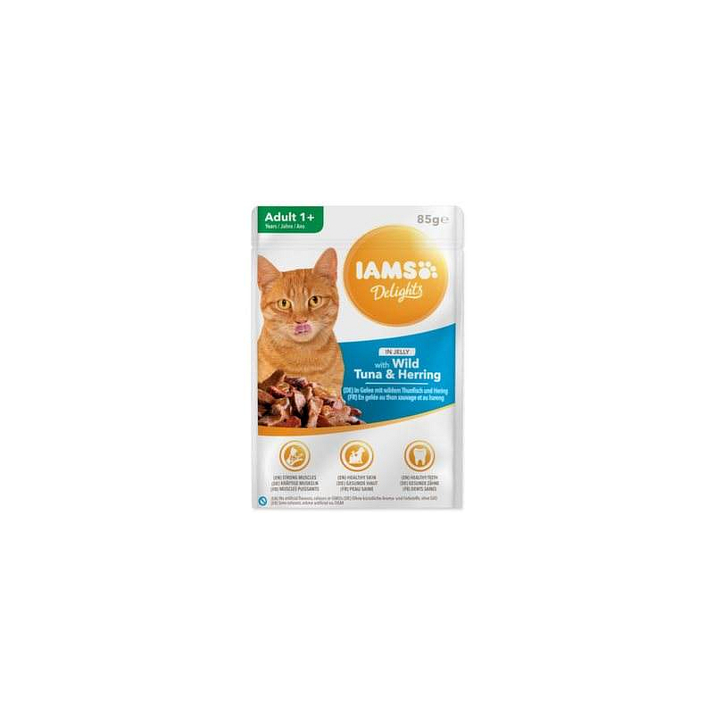 Kapsička pro kočky s masem z tuňáka a sledě v želé - kompletní krmivo pro dospělé kočky.