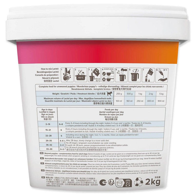 Do věku 8 týdnů by měl být Lactol Puppy Milk podáván jako doplňkové krmivo až do 40 ml na kg živé váhy denně. Dospělým březím, kojícím, nemocným nebo uzdravujícím se jedincům je možno podávat až 11 ml na kg živé váhy na den jako doplňkové krmivo.