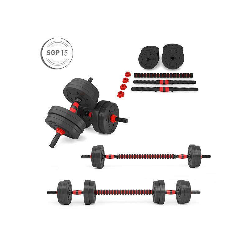 Kompletní nakládací sada dvou jednoručních a jedné obouruční činky o celkové hmotnosti 15 kilogramů, to je HMS SGP15. Nakládací činky patří ke klasickému vybavení každé domácí posilovny.