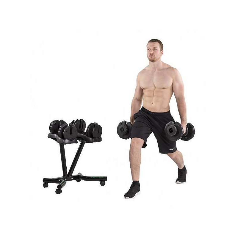 Pokud chcete cvičit s různými váhami, nemusíte si kupovat 10 různých činek. Stačí použít tuto činku Tunturi Selector Dumbbell. Umístíte činku do základní stanice a pomocí červeného tlačítka vedle talířů zvolíte váhu na 2,5 kg. Nepoužívané talíře zůstávají v základní stanici. Základní stanici lze také použít k uložení činky.