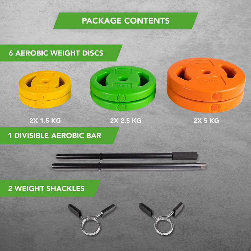 Kotouč 2x 5kg (oranžový),2x 2,5kg, (zelený) a 2x 1,5kg, (žlutý), 1x dutá tyč, 2x zajišťovací pružinová objímka.