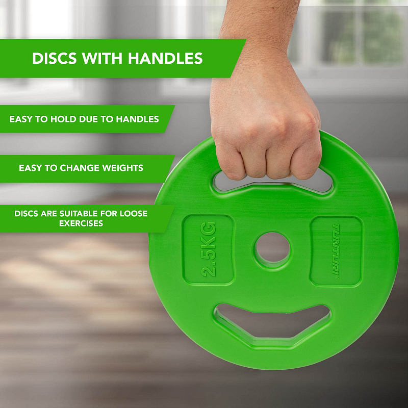 ○ 6 kotoučů: Oranžový: 2 x 5 kg. | Zelená: 2 x 2,5 kg. | Žlutá: 2 x 1,5 kg.