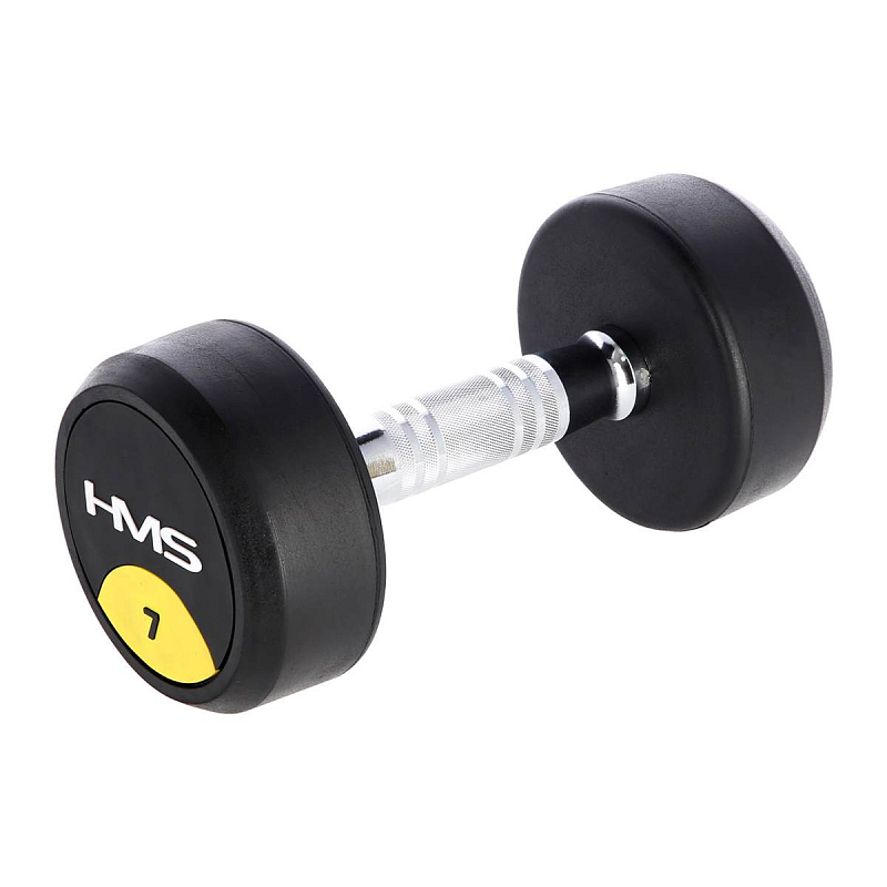 7-mi kilogramová jednoruční činka HMS HG Pro je určená pro profesionální použití jak doma tak v posilovně. Závaží tvoří litinový odlitek pokrytý silnou vrstvou gumy, která ochrání jak činku, tak podklad před poškozením. Na čelní straně je značka HMS a údaj o hmotnosti v kilogramech. Rukojeť je vyrobena z chromované oceli, pro pohodlný úchop má soudkovitý tvar s vroubkovaným povrchem.