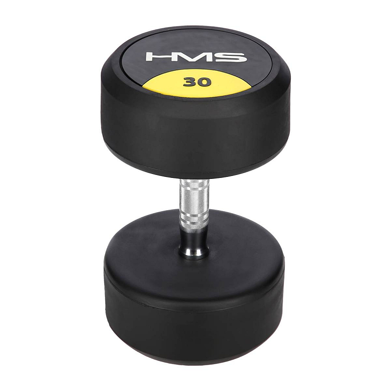 30-ti kilogramová jednoruční činka HMS HG Pro je určená pro profesionální použití jak doma tak v posilovně. Závaží tvoří litinový odlitek pokrytý silnou vrstvou gumy, která ochrání jak činku, tak podklad před poškozením. Na čelní straně je značka HMS a údaj o hmotnosti v kilogramech. Rukojeť je vyrobena z chromované oceli, pro pohodlný úchop má soudkovitý tvar s vroubkovaným povrchem.