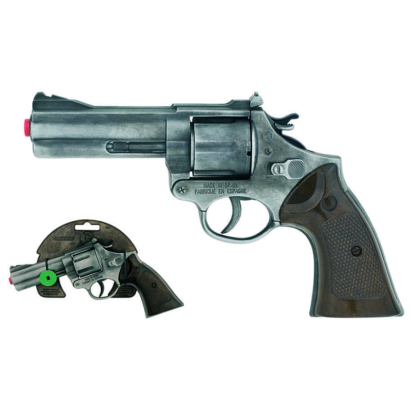 Policejní revolver z edice Gold colection – kovový, stříbrný, na kapslíky – dvanáct ran. Velikost revolveru 21,5,x13 cm. Vyrobeno ve Španělsku.