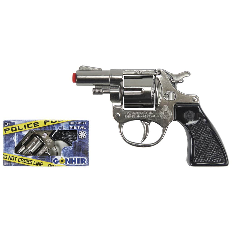 Policejní revolver kovový, stříbrný – na kapslíky osm ran.Velikost pistole 13×8,5 cm. Vyrobeno ve Španělsku.