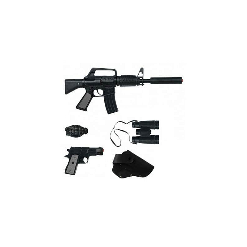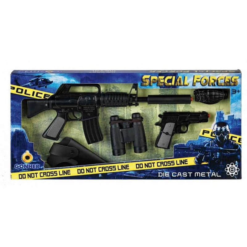 Policejní sada Speciální jednotky obsahuje kovou policejní pistoli, tlumič, dalekohled, policejní odznak, pouzdro na pistoli a policejní samopal. Vše je vyrobeno z kovu. Vše je na kapslíky – osm ran. Vyrobeno ve Španělsku.