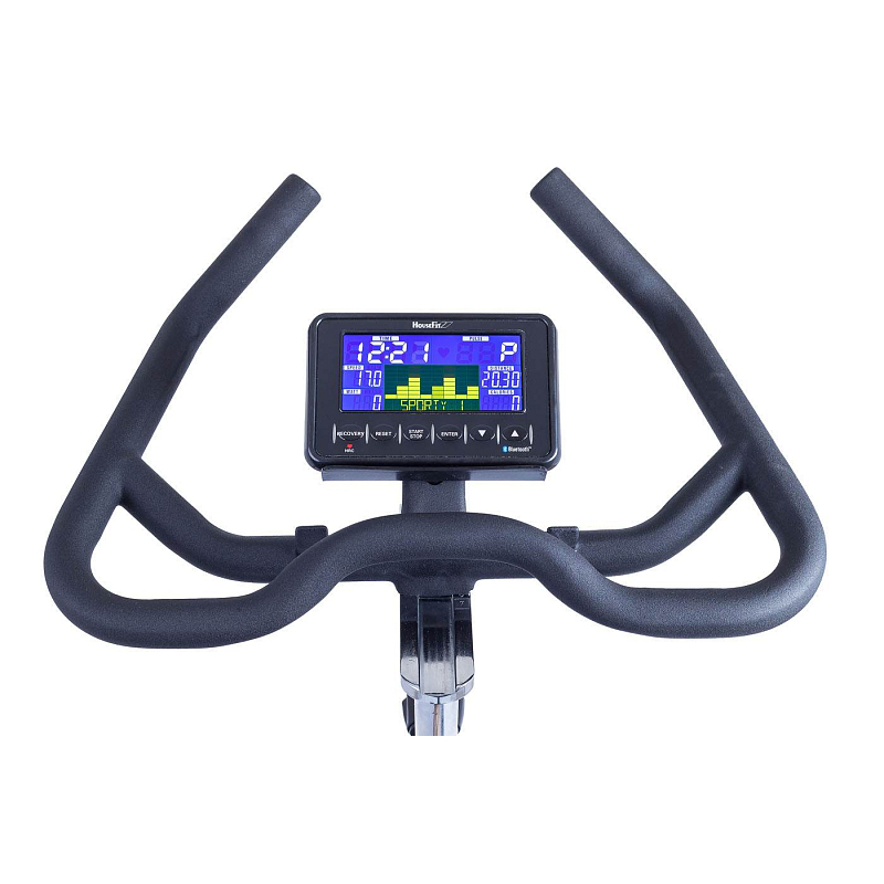 Tréninkový počítač s barevně podsvíceným displejem zobrazuje základní všechny důležité hodnoty jako je čas, aktuální rychlost, otáčky RPM, ujetá vzdálenost, spálené kalorie a hodnotu tepové frekvence.