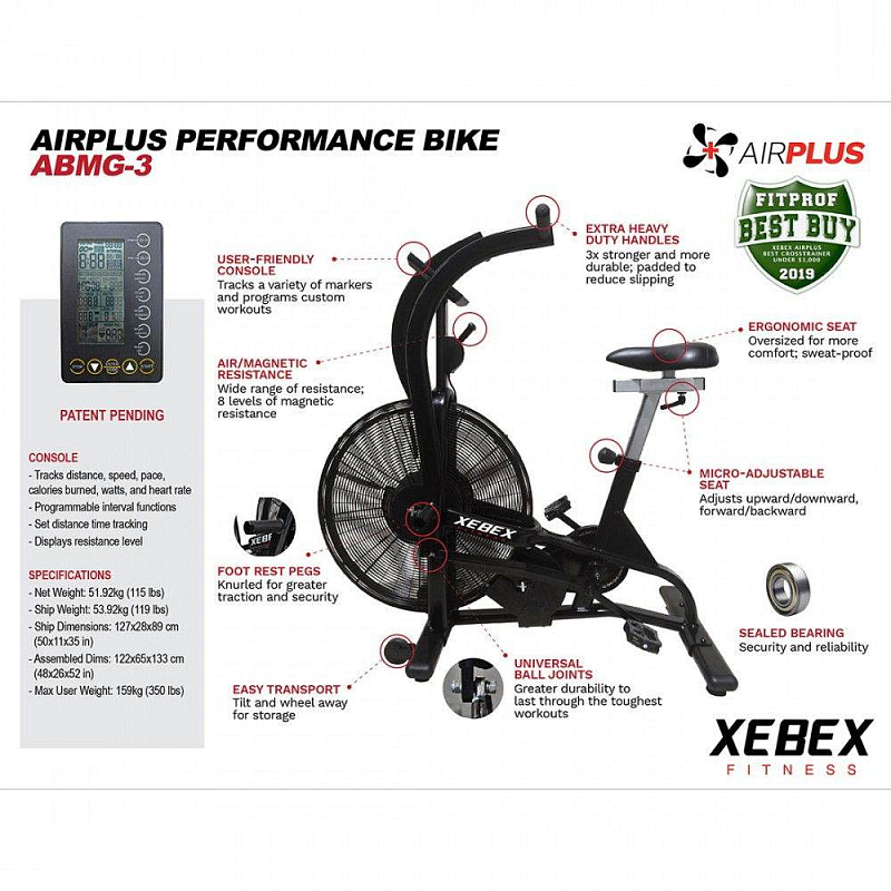 XEBEX AirPlus Performance Bike Smart Connect vyniká především svoji ergonomií, mechanikou a vzducho-magnetickým odporovým systémem. Díky vzduchovému odporu můžete uživatel simulovat 0-15% úhel při jízdě do kopce. Díky magnetickému odporu AirPlus může uživatel navíc zvýšit odpor až 4x. Trenažér má nastavitelné sedlo v horizontálním i vertikálním směru + sklon sedla. Dále disponuje vyrovnávači nerovnosti podlahy a transportními kolečky pro snadnější manipulaci v prostoru.