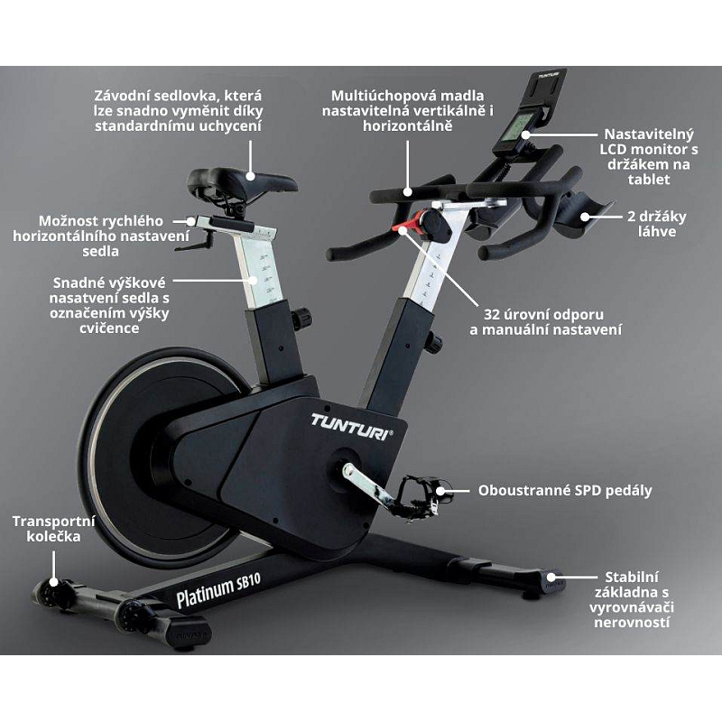 Cyklotrenažér TUNTURI PLATINUM S10 je vysoce kvalitní cyklotrenažér s rychlým manuálním nastavením odporu, ideální pro skupinové lekce i celou rodinu. A je ideální i pro domácí použití k jednoduchému udržování kondice. S10 je vše, co potřebujete pro efektivní a rozmanité cvičení.