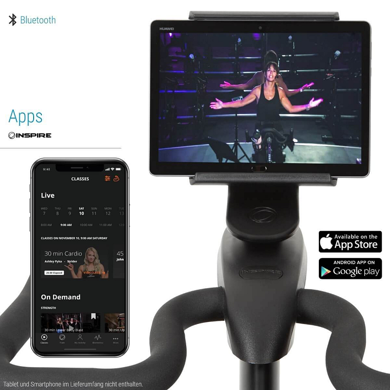 Aplikace Inspire Fitness přináší kurzy cyklistiky, které si můžete vychutnat z pohodlí vašeho domova. Aplikaci Inspire Fitness snadno a rychle nainstaujete do vašeho tabletu nebo smartphonu. Jednoduše naskenujte QR kód umístěný na držáku tabletu a postupujte podle pokynů na vašem mobilním zařízení. K dipozici je více než 150 různých workoutů a další denně přibývají! Aplikace vám na první pohled zobrazí všechna důležitá tréninková data a spojí vás s profesionálními trenéry, kteří vás motivují a povzbuzují v průběhu vašeho tréninku! Zažijte kurzy cyklistiky stejně jako v tělocvičně, přitom ale v pohodlí svého domova, kdykoli budete chtít.
