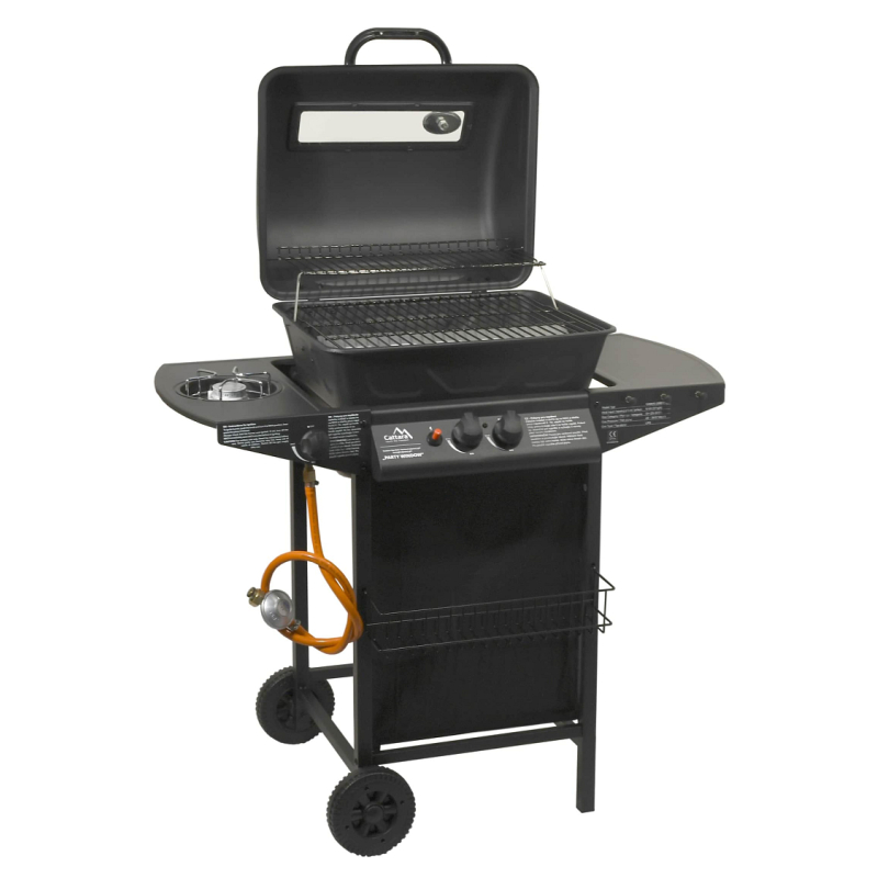 Plynový zahradní gril se systémem Flame Tamer - nevyžaduje lávové kameny. Dvojitý hlavní a jeden boční nerezový hořák s piezo zapalováním a plynulou regulací.
