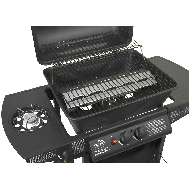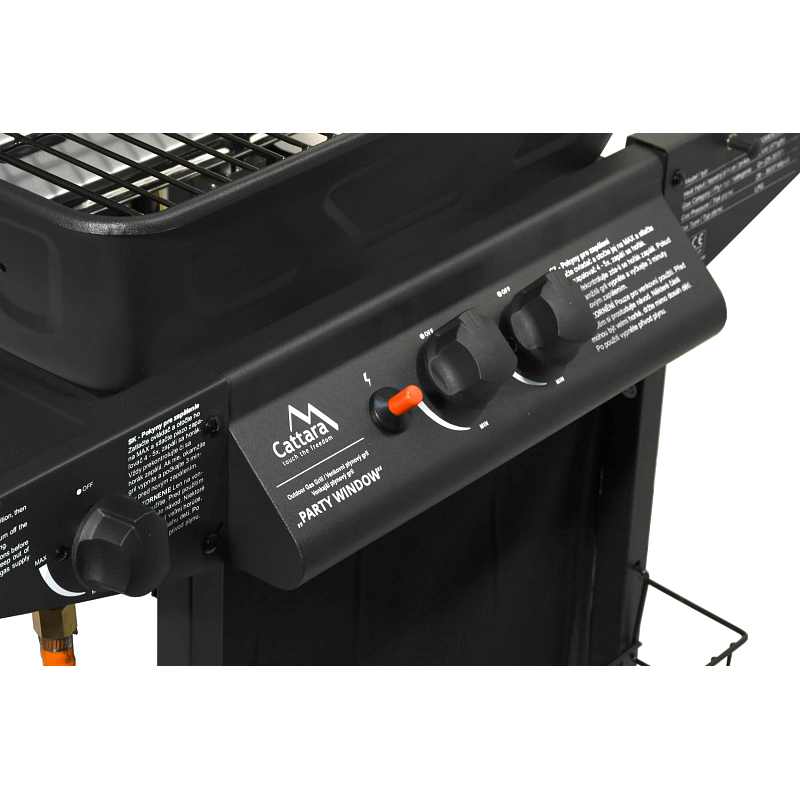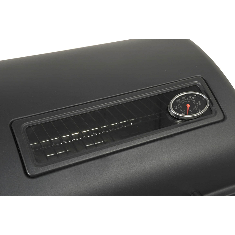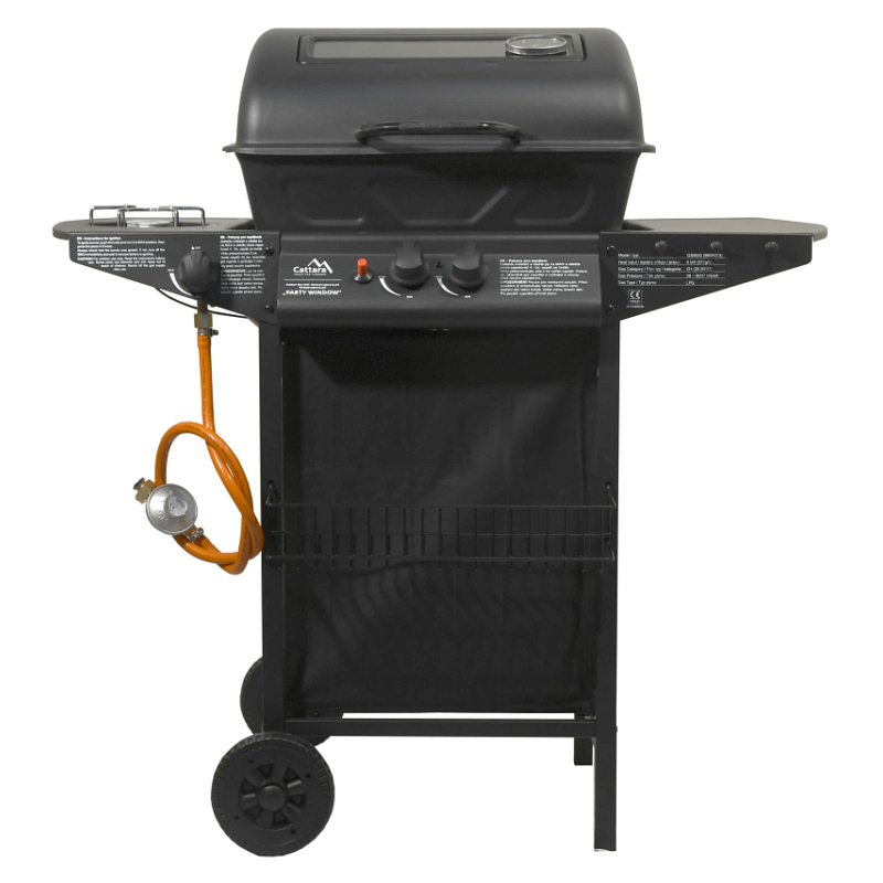 Sklopné víko grilu je opatřeno průzorem, díky kterému je možné sledovat stav grilovaných pokrmů bez otevírání grilu. Gril je pojízdný (2 kolečka), je dále vybaven odkládacími poličkami na obou stranách. Součástí je i spojovací hadice k plynové lahvi a redukční ventil.