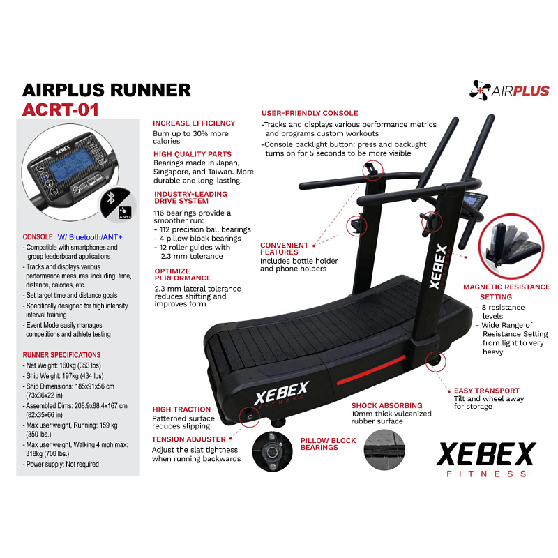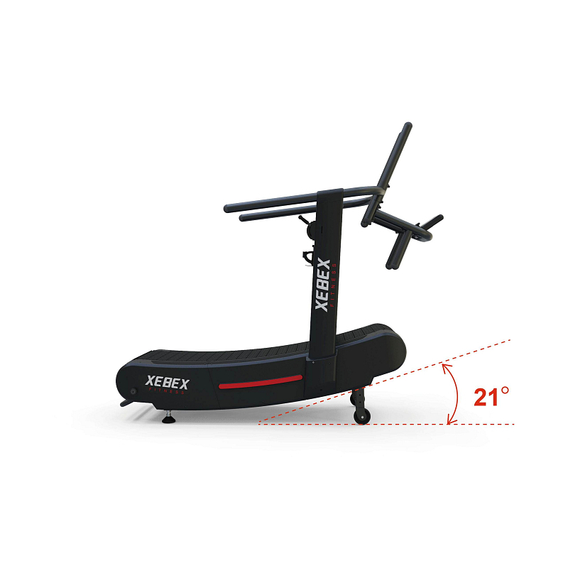 Běžecký pás XEBEX AirPlus Runner Smart Connect 2.0 je prohnutý lamelový pás, který je poháněn samotným běžcem. Rychlost si regulujete změnou místa běhu, když se posouváte vpřed, pás zrychluje a když se posouváte vzad, pás zpomaluje.
