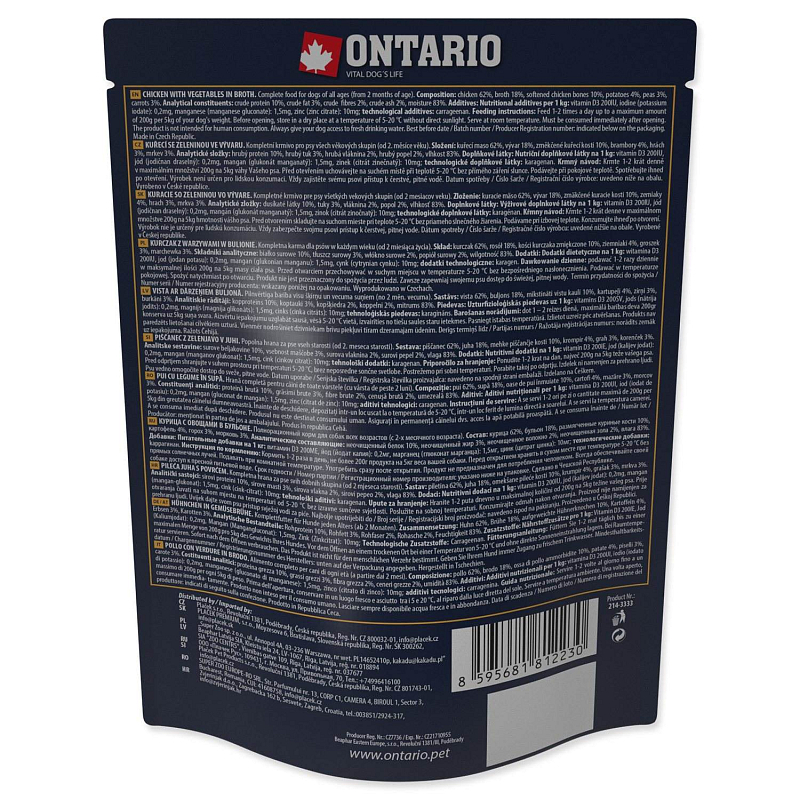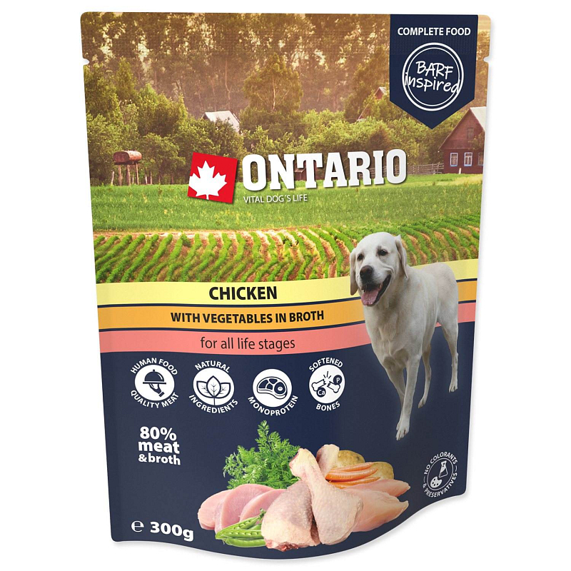 Monoproteinové, kompletní krmivo pro psy všech věkových skupin (od 2. měsíce věku) inspirováno Barfem. Receptura obsahuje změkčené kuřecí kosti, které jsou důležité pro svůj obsah fosforu a vápníku. Při výrobě kapsiček jsou používány pouze vysoce kvalitní ingredience čistě přírodního charakteru. Maso je v kvalitě pro lidskou spotřebu. Kapsičky jsou tepelně sterilizované, neobsahují tak žádné konzervanty. Přirozený vzhled a aroma bez jakýchkoli dochucovadel a barviv. Složení: kuřecí maso 62%, vývar 18%, změkčené kuřecí kosti 10%, brambory 4%, hrách 3%, mrkev 3%. Analytické složky: hrubý protein 10%, hrubý tuk 3%, hrubá vláknina 2%, hrubý popel 2%, vlhkost 83%. Doplňkové látky: Nutriční doplňkové látky na 1 kg: vitamin D3 200IU, jód (jodičnan draselný): 0,2mg, mangan (glukonát manganatý): 1,5mg, zinek (citrát zinečnatý): 10mg; technologické doplňkové látky: karagenan. Krmný návod: Krmte 1-2krát denně v maximálním množství 200g na 5kg váhy Vašeho psa. Před otevřením uchovávejte na suchém místě při teplotě 5-20 °C bez přímého záření slunce. Podávejte při pokojové teplotě. Spotřebujte ihned po otevření. Výrobek není určen pro lidskou konzumaci. Vždy zajistěte svému psovi přístup k čerstvé, pitné vodě.