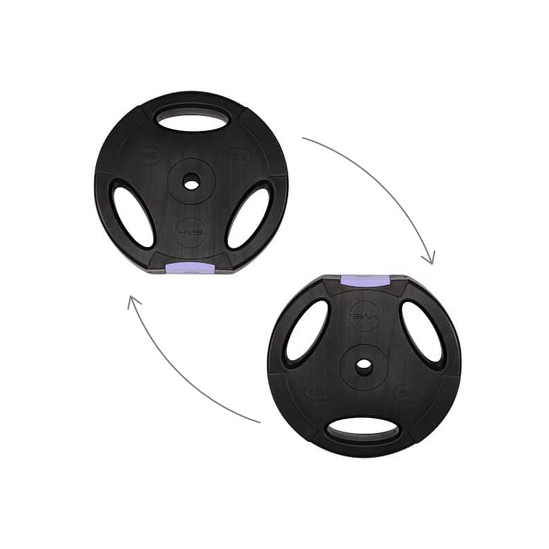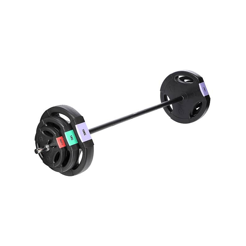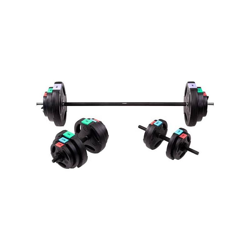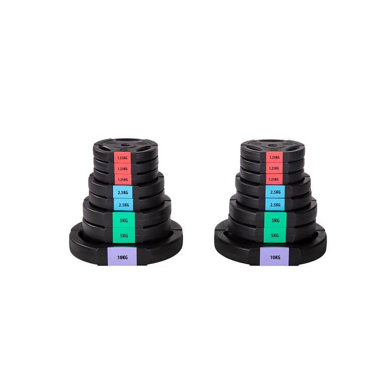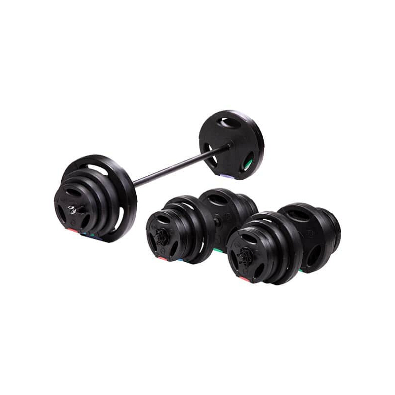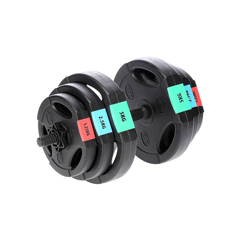 Kotouče jsou vyrobeny z trvdého plastu, který je vyplněn cementem. Obouruční osa je tvořena ze tří částí, které se do sebe skládají pomocí šroubení. Nakládací trny jsou hladké a závaží se zajišťuje pružinovými svorkami. Trny jednoručních činek jsou opatřeny závitem a závaží je jištěno hvězdicovými maticemi.