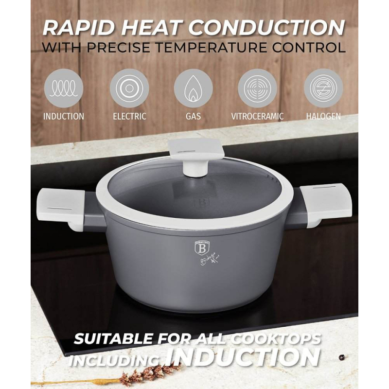 Hledáte vhodnou sadu nádobí do vaší kuchyně? Sadou získáte všechny potřebné nádoby na vaření, ať už budete vařit pro sebe nebo pro více osob. Velkou výhodou je, že můžete objednat najednou více nádobí od ověřeného výrobce BERLINGERHAUS. Sadu nádobí sjednocuje jednotný design, navíc šedá barva celé sady je univerzální a vyjímat se bude v každé kuchyni.