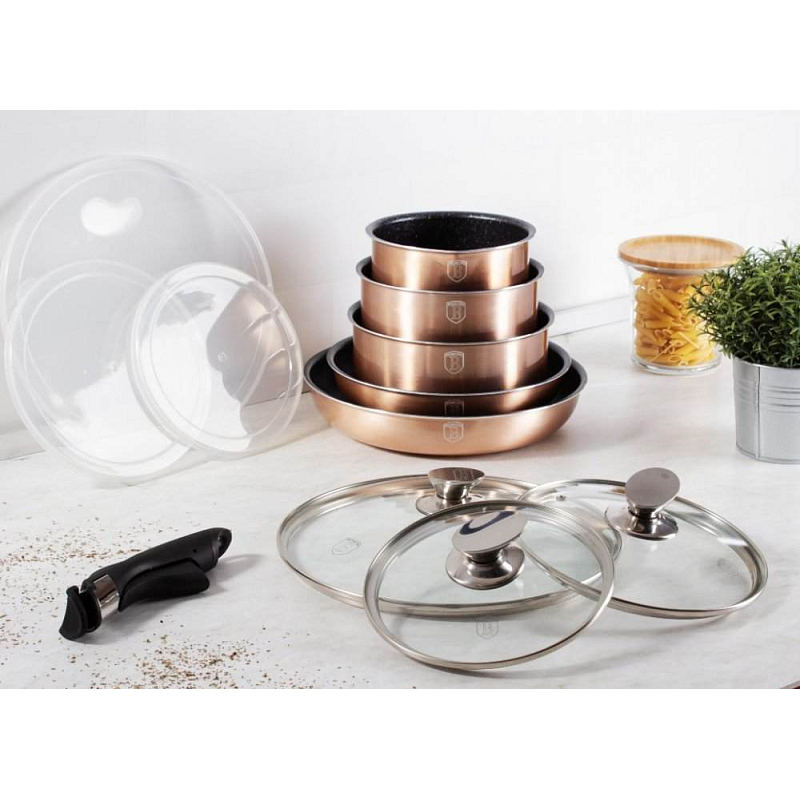 Hledáte vhodnou sadu nádobí do vaší kuchyně? Sadou získáte všechny potřebné nádoby na vaření, ať už budete vařit pro sebe nebo pro více osob. Velkou výhodou je, že můžete objednat najednou více nádobí od ověřeného výrobce BERLINGERHAUS. Sadu nádobí sjednocuje jednotný design, navíc zlatá barva celé sady je univerzální a vyjímat se bude v každé kuchyni.