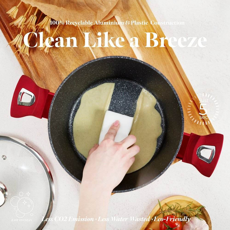 - doménou této sady je 3vrstvý povrch s mramorovým designem charakteristický svou dokonalou nepřilnavostí, žádné potraviny se nepřipalují a díky tomu se kastroly i pánve velice snadno čistí
