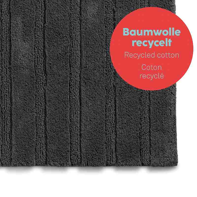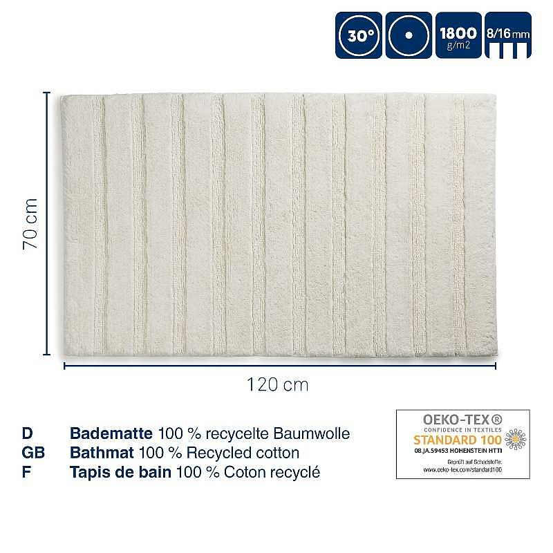 Koupelnová předložka Megan v rozměru 120 × 70 cm je vyrobena ze 100% recyklované bavlny s vysokou gramáží 1800 g/m², která poskytuje měkký, hřejivý a komfortní povrch. Materiál splňuje certifikaci OEKO‑TEX® Standard 100, takže je bezpečný a zdravotně nezávadný.