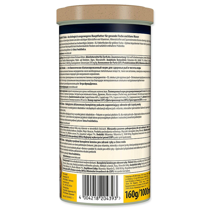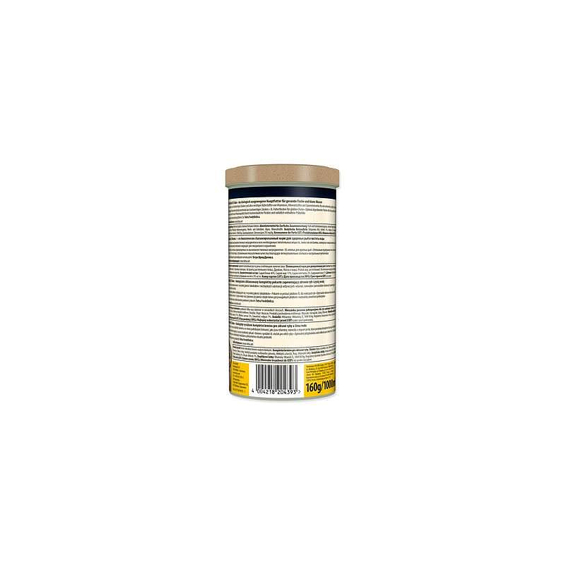 Kompletní krmivo pro okrasné ryby. Obsahuje 40 pečlivě vybraných, vysoce kvalitních surovin, zahrnujících veškeré významné živiny pro život, vitamíny a stopové prvky. Posiluje obranné mechanismy jejich organismu, kladně ovlivňuje stavbu kostry a napomáhá růstu. Krmný návod: krmte několikrát denně malé množství. Složení: ryby a vedlejší výrobky z ryb, obiloviny, kvasnice, rostlinné bílkovinné extrakty, měkkýši a korýši, oleje a tuky, mořské řasy, cukr. Jakostní znaky: hrubé proteiny 48%, vlhkost 6%, hrubé oleje a tuky 9%, hrubé popeloviny 11%, hrubá vláknina 2%, vitamín A 37600 m.j./ kg, vitamín D3 2000 m.j./ kg, vitamín E (alfatokoferol) 125 mg / kg, L-askorbyl-2-polyfosforečnan (stabilizovaný vitamín C) 515 mg / kg.