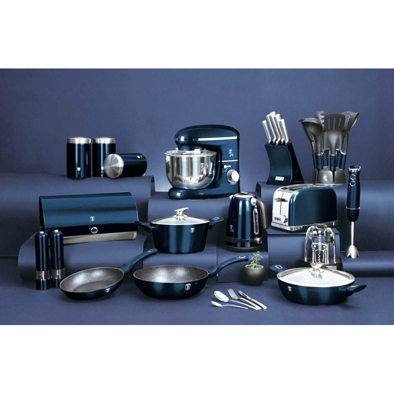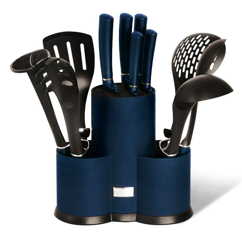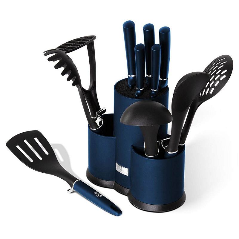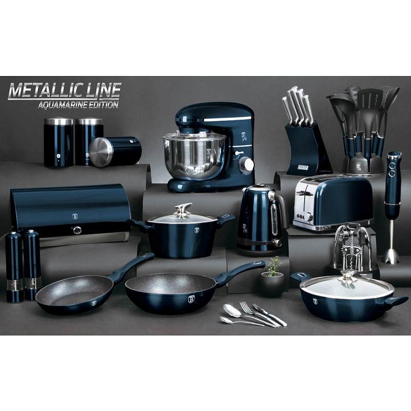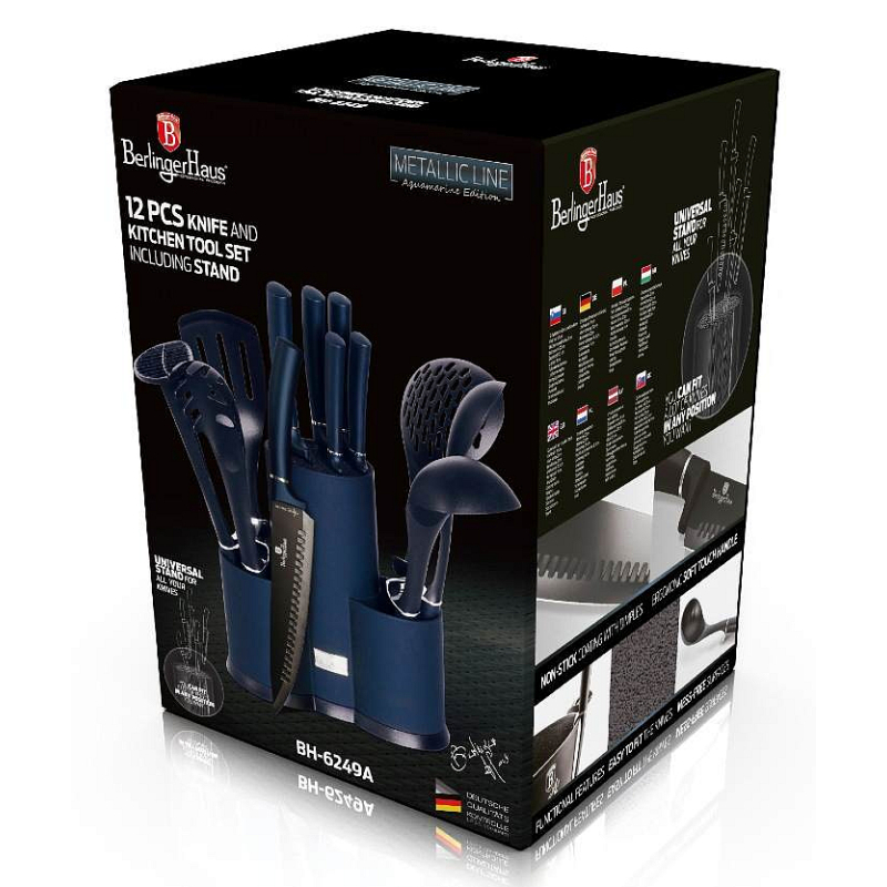 Sada nožů a kuchyňského náčiní ve stojanu 12 ks Aquamarine Metallic Line je výbornou alternativou pro kuchaře různých úrovní, na jejíž výrobu byl použit kvalitní materiál: nerez ocel s nepřilnavým povrchem, vynikají perfektní ostrostí čepele a designem. Velmi oceníte i ergonomicky tvarovanou rukojeť, díky které se vám nože budou skvěle držet. Celá sada je dílem výrobce BERLINGERHAUS, jež se výrobě nožů věnuje poměrně dlouho a jsou řádně odzkoušeny.