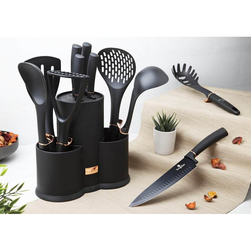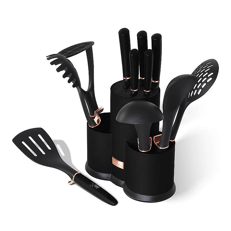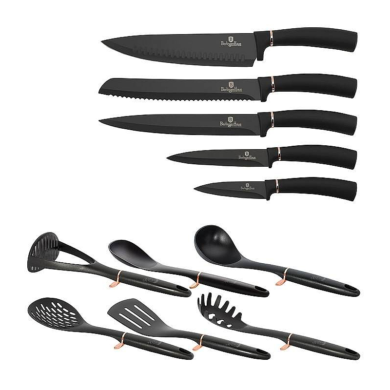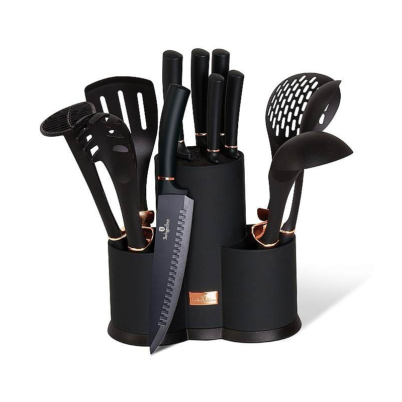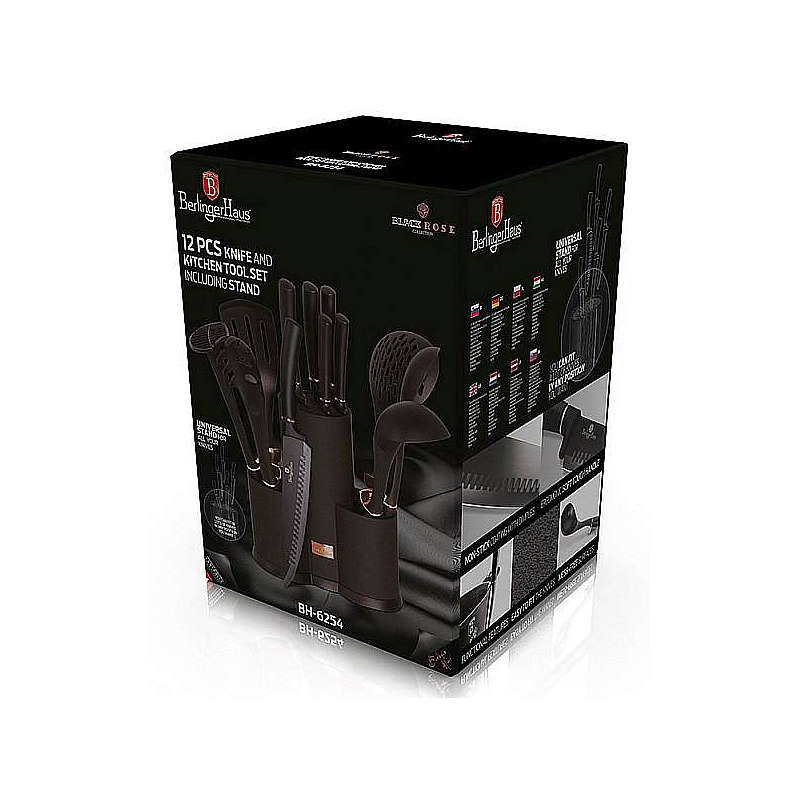 Sada nožů a kuchyňského náčiní ve stojanu 12 ks Black Rose Collection je výbornou alternativou pro kuchaře různých úrovní, na jejíž výrobu byl použit kvalitní materiál: nerez ocel s nepřilnavým povrchem, vynikají perfektní ostrostí čepele a designem. Velmi oceníte i ergonomicky tvarovanou rukojeť, díky které se vám nože budou skvěle držet. Celá sada je dílem výrobce BERLINGERHAUS, jež se výrobě nožů věnuje poměrně dlouho a jsou řádně odzkoušeny.