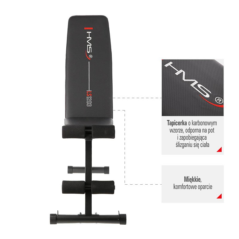 Sedák a opěrka byly vyrobeny velmi pečlivě. Tvrdá deska pokrytá silnou pěnou zaručuje komfort při cvičení. Čalounění má karbonový vzhled s vyšitým logem značky HMS, které je odolné proti potu a je protiskluzové. Součástí výbavy jsou i opěnové válce, které chrání před oděrem nohou při tréninku.