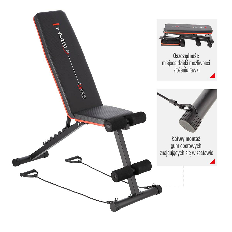 HMS LS1203 je multifunkční posilovací lavice, která je ideální pro domácí trénink. Nastavitelná zádová opěrka v sedmi úrovních od -30 do 60°, zarážka nohou nohou a gumové expandéry umožňují uživateli provádět mnoho nových a pokročilých cviků, což se promítá do efektivnějšího tréninku než dříve. Sluší se dodat, že lavička se velmi snadno sestavuje a po tréninku ji lze rychle složit.