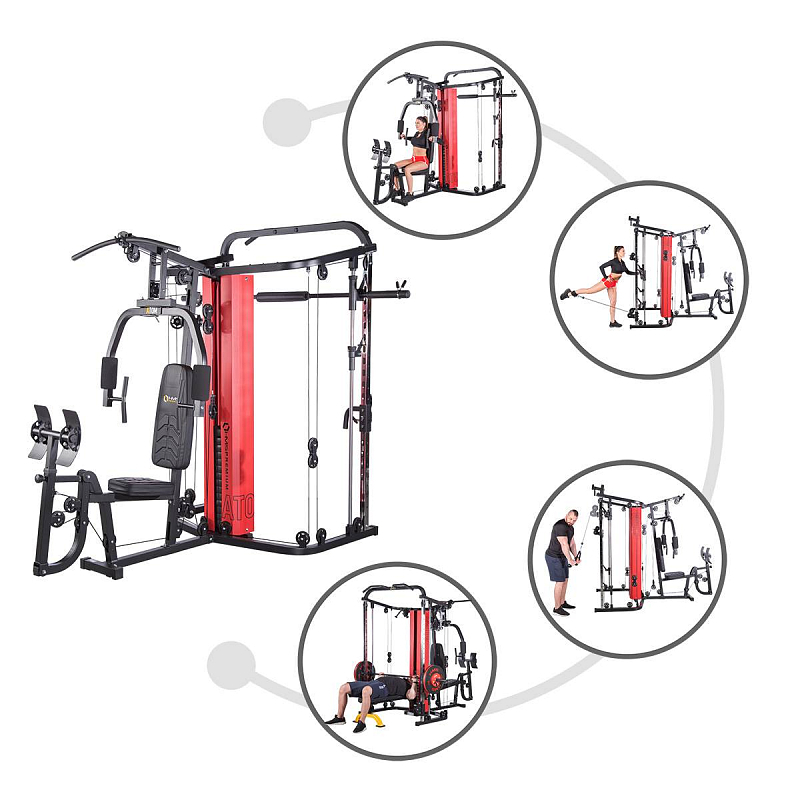 ATOM v sobě snoubí multipress, dvě posuvné kladky, rameno na tlaky / motýlka, leg press a hrazdu, takže jde o skutečně komplexní stroj. Součástí dodávky je také dvojité, tricepsové lano, tricepsový adaptér, popruhy ke kladkám a opasek na kotník.