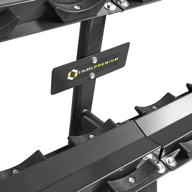 Stojan na jednoruční činky HMS Premium STR23 je ideálním pomocníkem pro uložení 10-ti párů činek. Kvalitní, ocelová konstrukce ja vyrobena z profilu 80 x 40 mm, díky tomu unese zatížení až 1.000 kilogramů. Stojan STR23 má dvě "kolejnice" o rozměru 233 x 22 centimetrů, které jsou umístěny nad sebou pro snadnou orientaci mezi odkládaným náčiním. Ke každé polici jsou připevněny profilované, gumové podložky, do kterých se ukládají jednotlivé činky. Guma zamezuje pohybu činky a zároveň ji chrání před poškozením. Šest noh stojanu je opatřeno gumovými patkami, které chrání podlahu před jejím poškozením.
