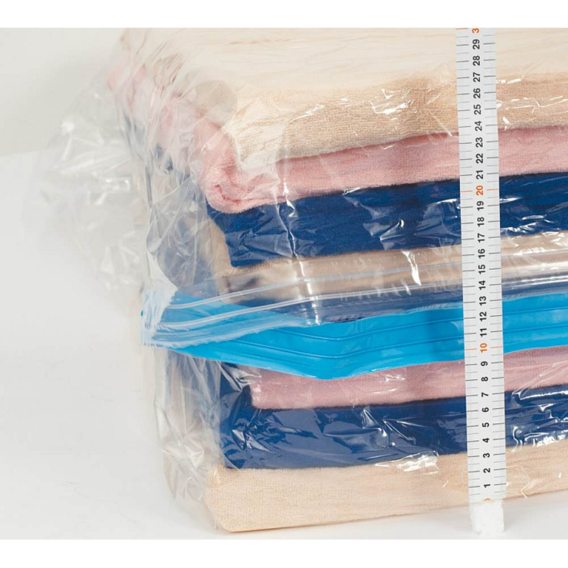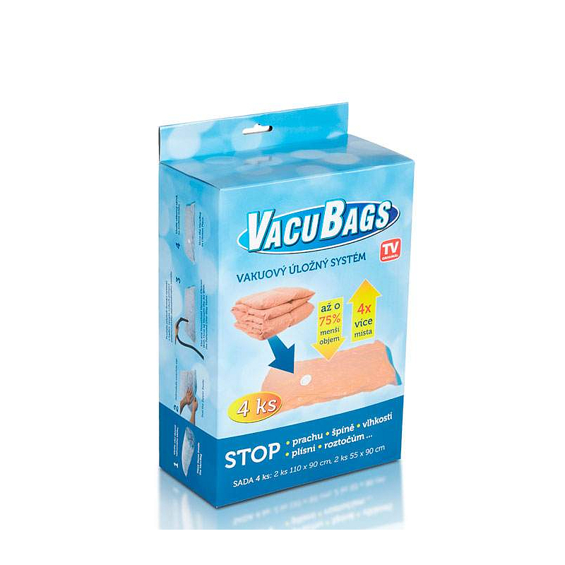 Výborné řešení i pro dovolenou nebo stěhování, zejména když zavazadlový prostor Vašeho automobilu se nedá nafouknout, protože naše vakuové pytle Vacu Bags jdou vyfouknout, čímž se radikálně zmenší objem vašich zavazadel. Vacu Bags navíc Vaše oděvy spolehlivě ochrání. Odsátím vzduchu pomocí běžného vysavače zlikvidujete i roztoče, chráníte věci před vlhkostí, škůdci a prachem (jsou vhodné pro uložení lůžkovin, spacáků, oblečení, plyšových hraček apod). Prostor pro uskladnění se stane dostačujícím, účelnějším a lépe organizovaným než kdykoli předtím. Vakuové pytle jsou vyrobeny z pevného a odolného plastu, lze je použít opakovaně.