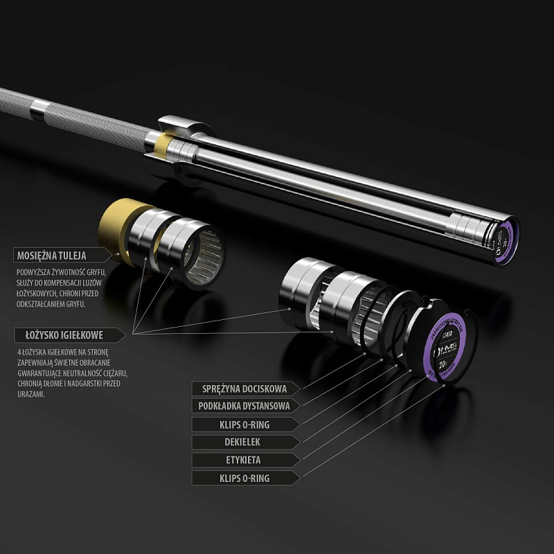 Olympijská hřídel GO450 HMS byla vyrobena ze speciální chromované oceli, která prošla procesem kalení. Produkt HMS se vyznačuje pevností v kombinaci s dokonalou pružností. Součástí soupravy jsou dva plastové uzávěry ZG1000.. Pevné a pohodlné uchopení hřídele je zajištěno vroubkováním na povrchu. Maximální zatížení je 450 kg.