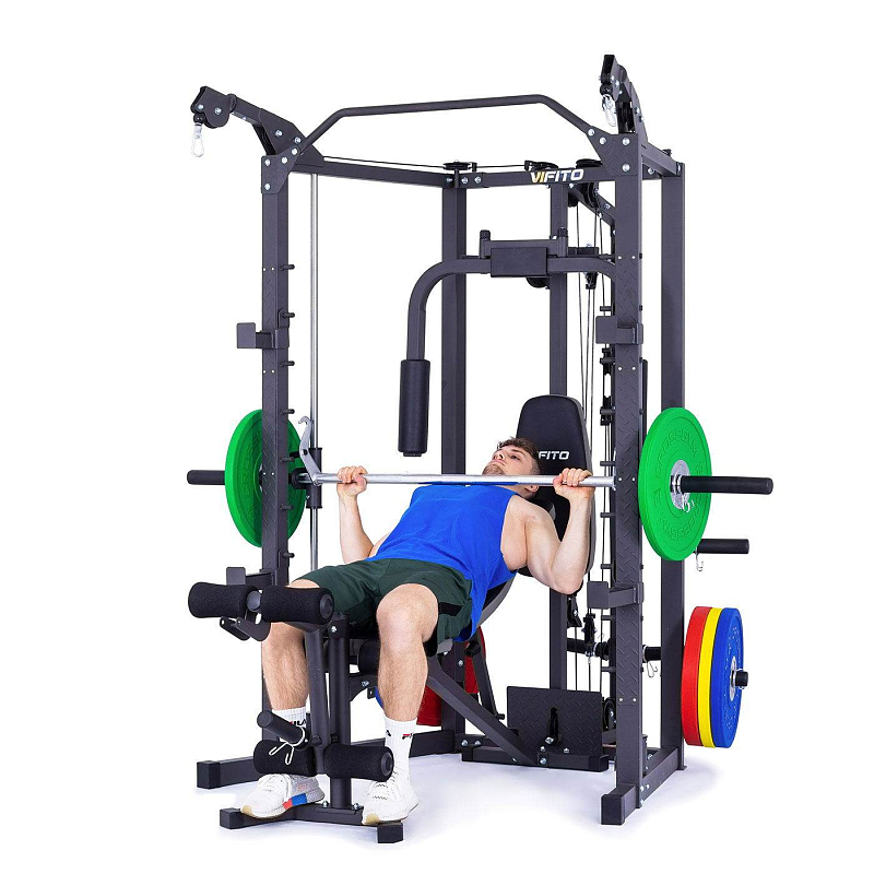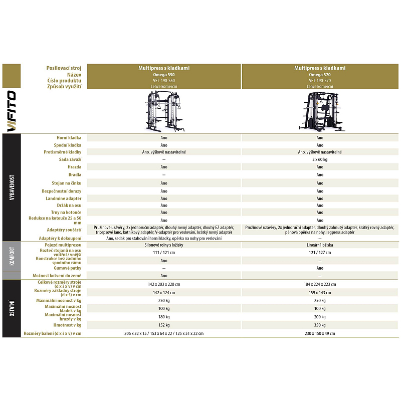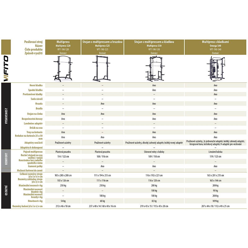 VIFITO Omega S40 má robustní konstrukci, kde máte možnost určit si výšku vedené osy multipressu pro daný cvik v 9 polohách podle vašich potřeb. K dispozici je chromovaná osa s nakládacími trny o průměru 25 mm nebo 50 mm (olympijské), díky standardně dodávanému adaptéru. Používat tak můžete jakékoli kotouče s vrtáním 25, 30, nebo 50 mm. Váhu si můžete určit podle vlastních potřeb a cvičit mohou začátečníci i zkušení jedinci.