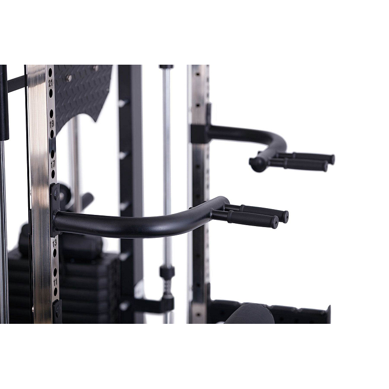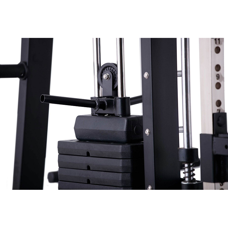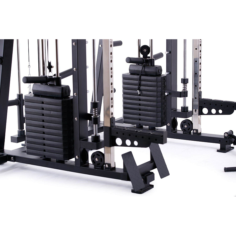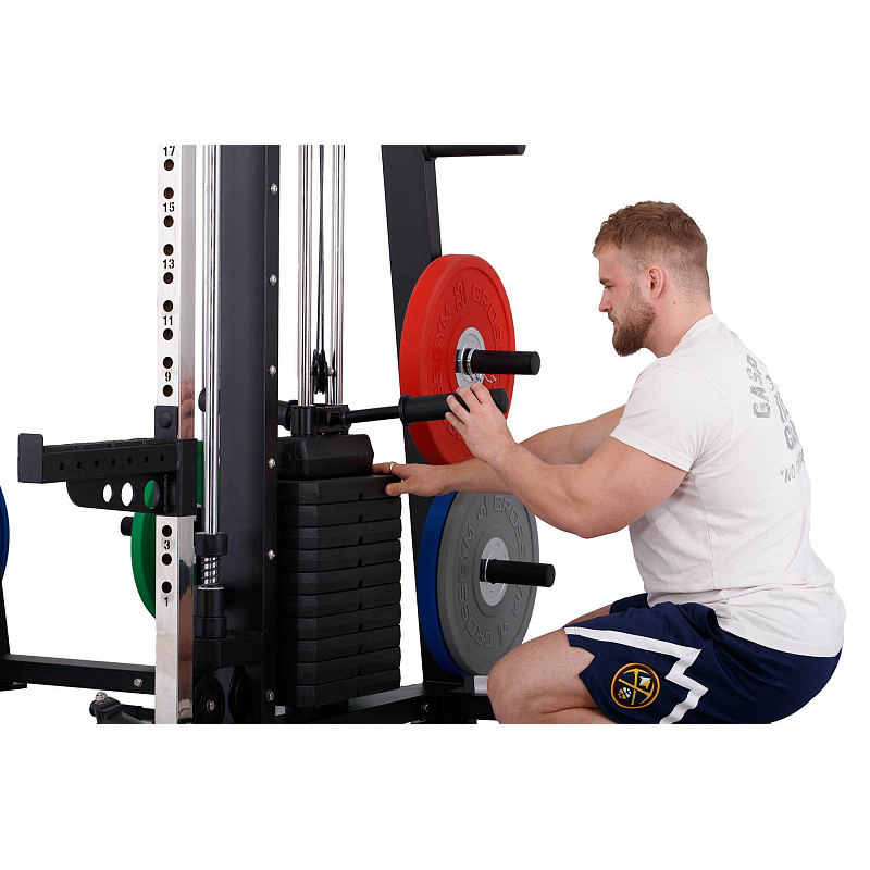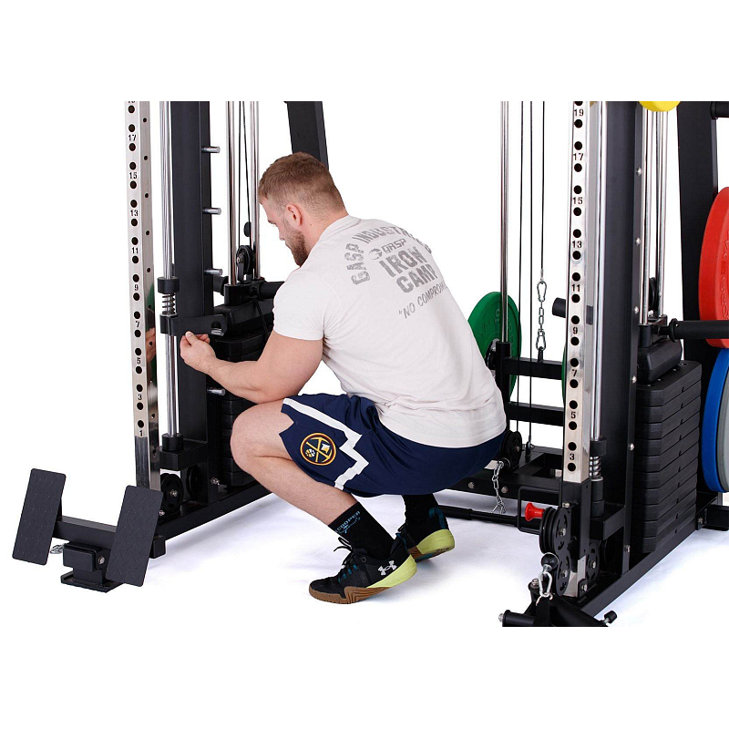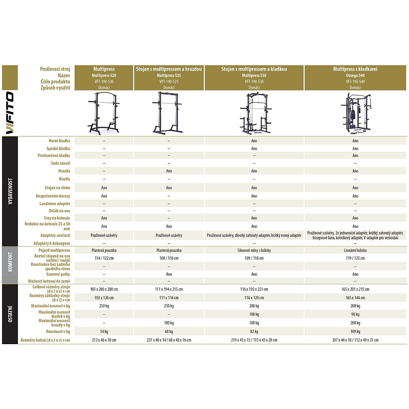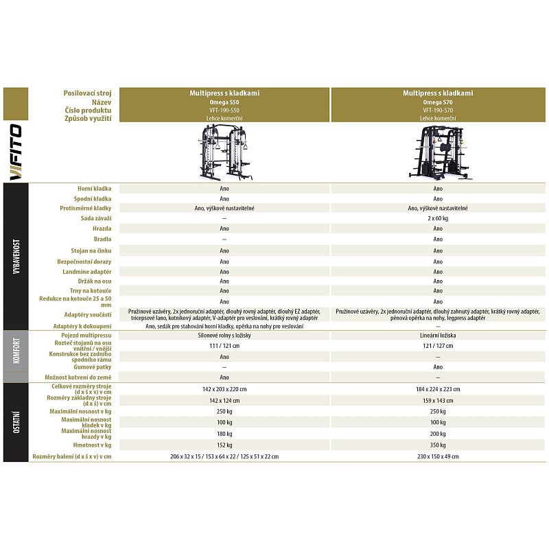 Multipress VIFITO Omega S70 nabízí dva zásobníky zátěže o váze 60 kg (dohromady tedy až 120 kg závaží!). Zároveň nabízí řadu posilovacích odnímatelných adaptérů např. tricepsových kliků, tlaků na prsa, ramena, kladek atd.. Dvě protisměrné kladky je možné polohovat v různých výškových polohách, můžete tak perfektně procvičit celé tělo.