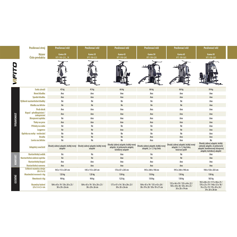 Posilovací věž VIFITO Gama 50 je pokročilým modelem oblíbené značky VIFITO. Věž je určena pro náročnější domácí využití, pro uživatele, kteří chtějí na relativně malém prostoru procvičit celé tělo, vytvarovat postavu a nabrat svalovou hmotu. Závaží je řešeno pomocí klasických cihliček, díky zpřevodování umožňuje na vybraných adaptérech cvičení s vahou až 90 kg. Nastavení požadované váhy je snadné, rychlé a bezpečné i pro začátečníky.