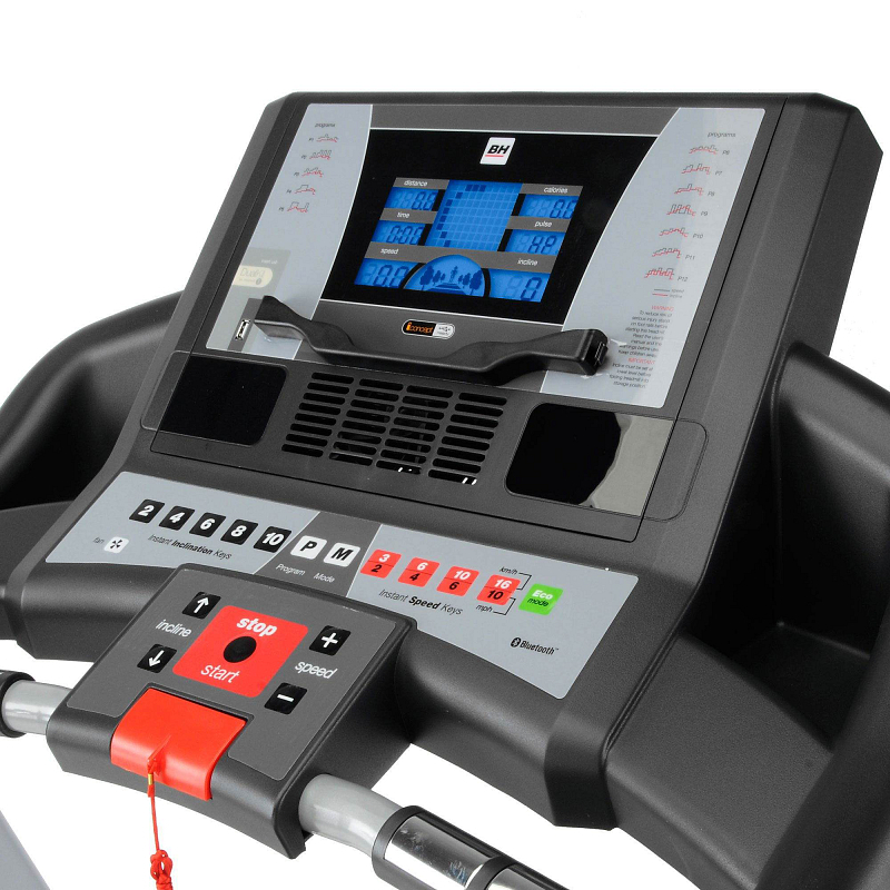 Ovládací konzole trenažeru BH Fitness F2W DUAL je vybavena přehledným LCD displejem s modrým podsvícením. Ovládání je velice jednoduché, kromě manuální regulace rychlosti a sklonu jsou součástí přednastavené zátěžové profily, které podle křivky regulují rychlost. Pro rychlé ovládání slouží tzv. "horké klávesy" s přednastavenými hodnotami rychlosti a sklonu. Jako většina běžeckých trenažerů je i tento běžecký pás možné sklopit do vertikální polohy.