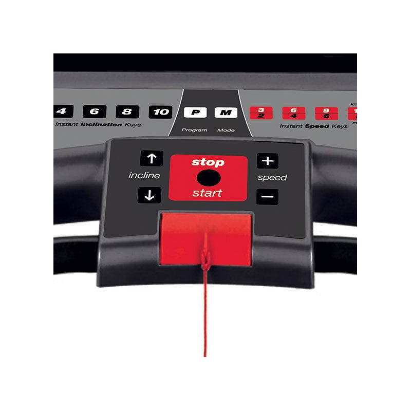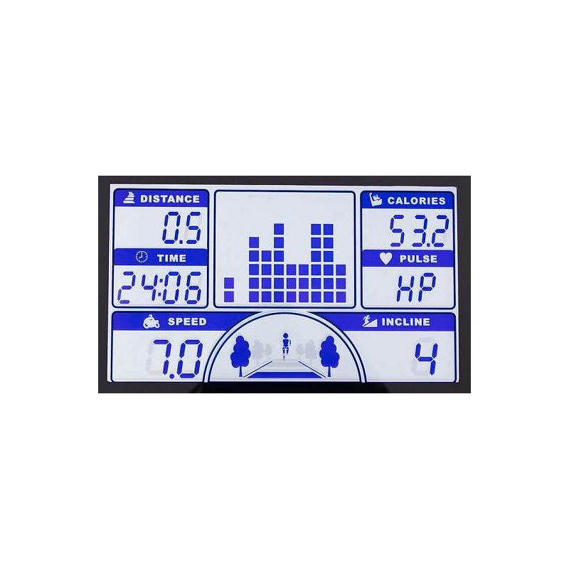 | Měřené hodnoty: | Spálené kalorie, Tep srdce, Vzdálenost, Signalizace překročení tepu, Čas běhu, Rychlost běhu, Sklon pásu |