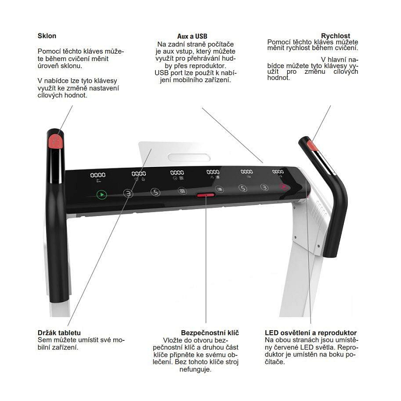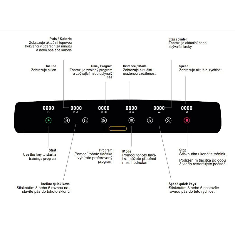 | Měřené hodnoty: | Spálené kalorie, Tep srdce, Vzdálenost, Čas běhu, Rychlost běhu, Sklon pásu |