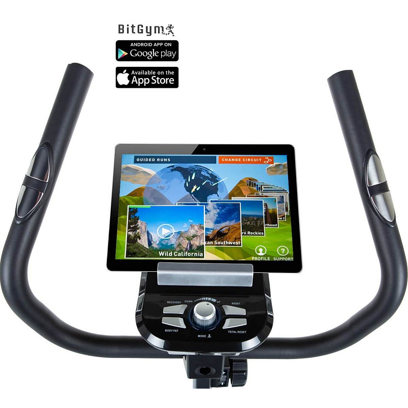 Na displeji najdete prakticky držák na smartphone nebo tablet, díky kterým můžete využívat tréninkovou aplikaci BitGym nebo Kinomap. Při cvičení tak můžete projíždět trasy po celém světě nebo se inspirovat tréninkovými videi. Výsledky svého tréninku navíc můžete uložit a porovnávat v čase. Tréninková aplikace nereguluje odpor trenažéru. Ten nastavujete manuálně. Tablet není součástí dodávky.