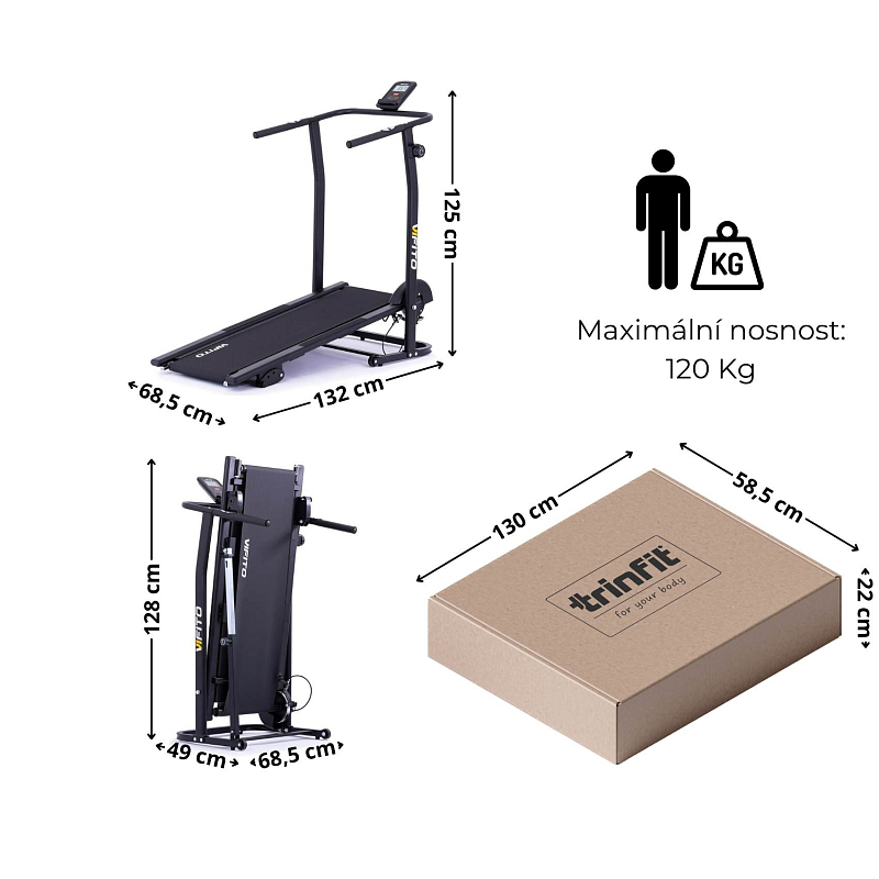 Manuálně nastavitelný sklon je nastavitelný do 3 poloh (14 %, 17 % a 20 %) a běžecká plocha má rozměry 35x120 cm, díky tomu můžete simulovat chůzi, či běh do kopce a ztížit si tak trénink.
