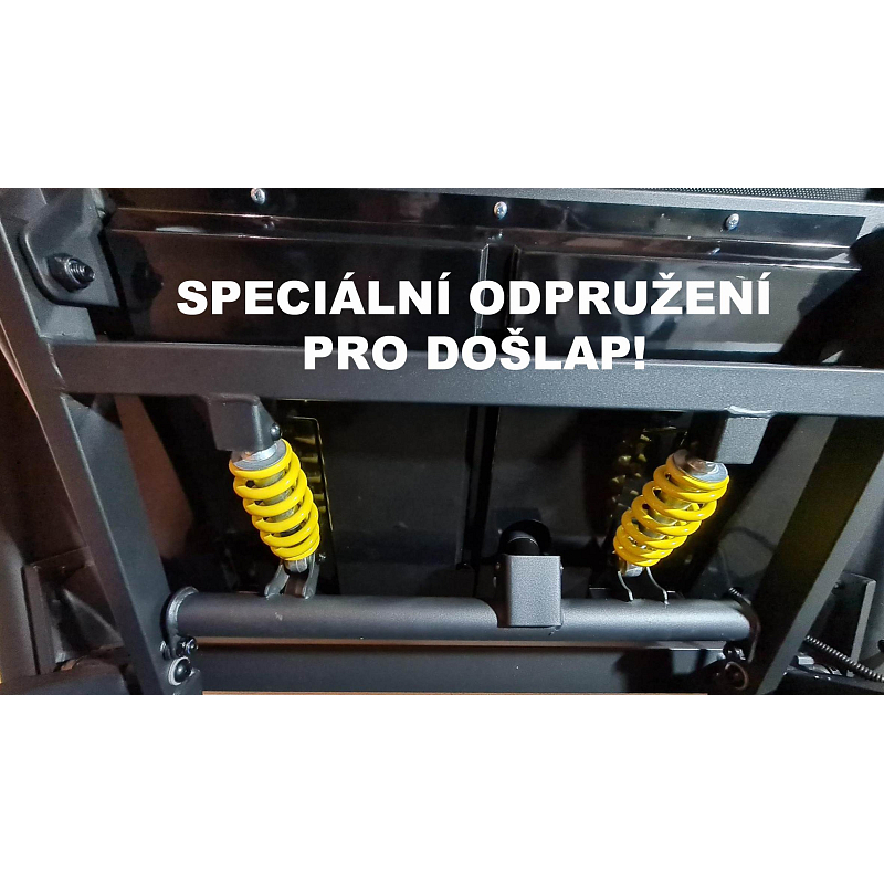Ještě měkčí 10bodové odpružení běžecké plochy zajišťuje naprosto pohodlný, přirozený a zároveň velmi tichý běh bez ohledu na výkonnost či hmotnost běžce. Snížení hluku a tlumení nárazů podporují také 4 speciální tlumící vložky mezi běhací plochou a kovovým rámem pásu. Kvalitní odpružení běžecké plochy snižuje dopad běhu na chodidla a klouby, minimalizuje jejich namáhání a předchází nepříjemným pocitům po tréninku. Díky odpružení je běžecký pás šetrnější pro vaše tělo, a vy se tak můžete věnovat tréninku bez obav ještě déle.