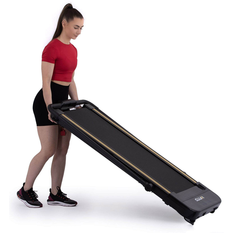 Pokud běžecký pás zrovna nepoužíváte, můžete jej jednoduše kompletně složit a uložit například pod postel. Sklopení a manipulaci s pásem usnadňují i transportní kolečka.
