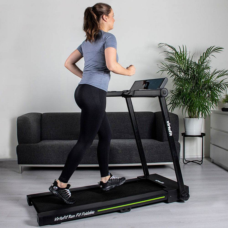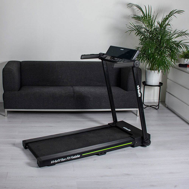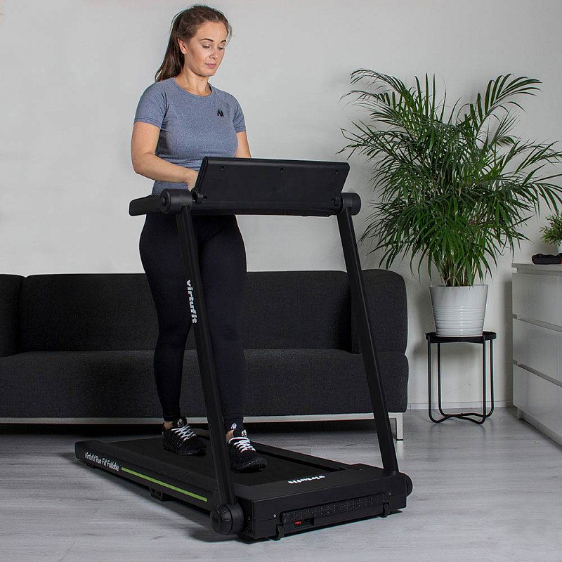 Běžecký trenažér VIRTUFIT Run Fit skládací je moderní běžecký pás, který je díky svým kompaktním rozměrům ideální volbou pro trénink v domácím prostředí. Pro maximální komfort je možné sklopit sloupky s konzolí a trenažér schovat například pod postel.
