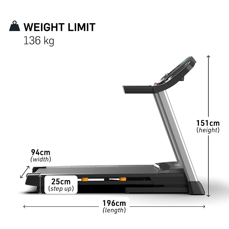 Neuvěřitelně široká a dlouhá běžecká plocha o rozměrech 51x140 cm zaručuje bezpečný běh nebo chůzi. Vysokou hmotnost uživatele až 136 kg zajišťuje pevná a odolná konstrukce pásu. Užijte si svou oblíbenou hudbu s integrovanými reproduktory ,výhodou je také konektivita sluchátek Bluetooth® a využijte pro pitný režim 2 držáky na nápoje..Po skončení tréninku běžeckou desku snadno zvednete a převezete, abyste maximálně využili prostor v místnosti.